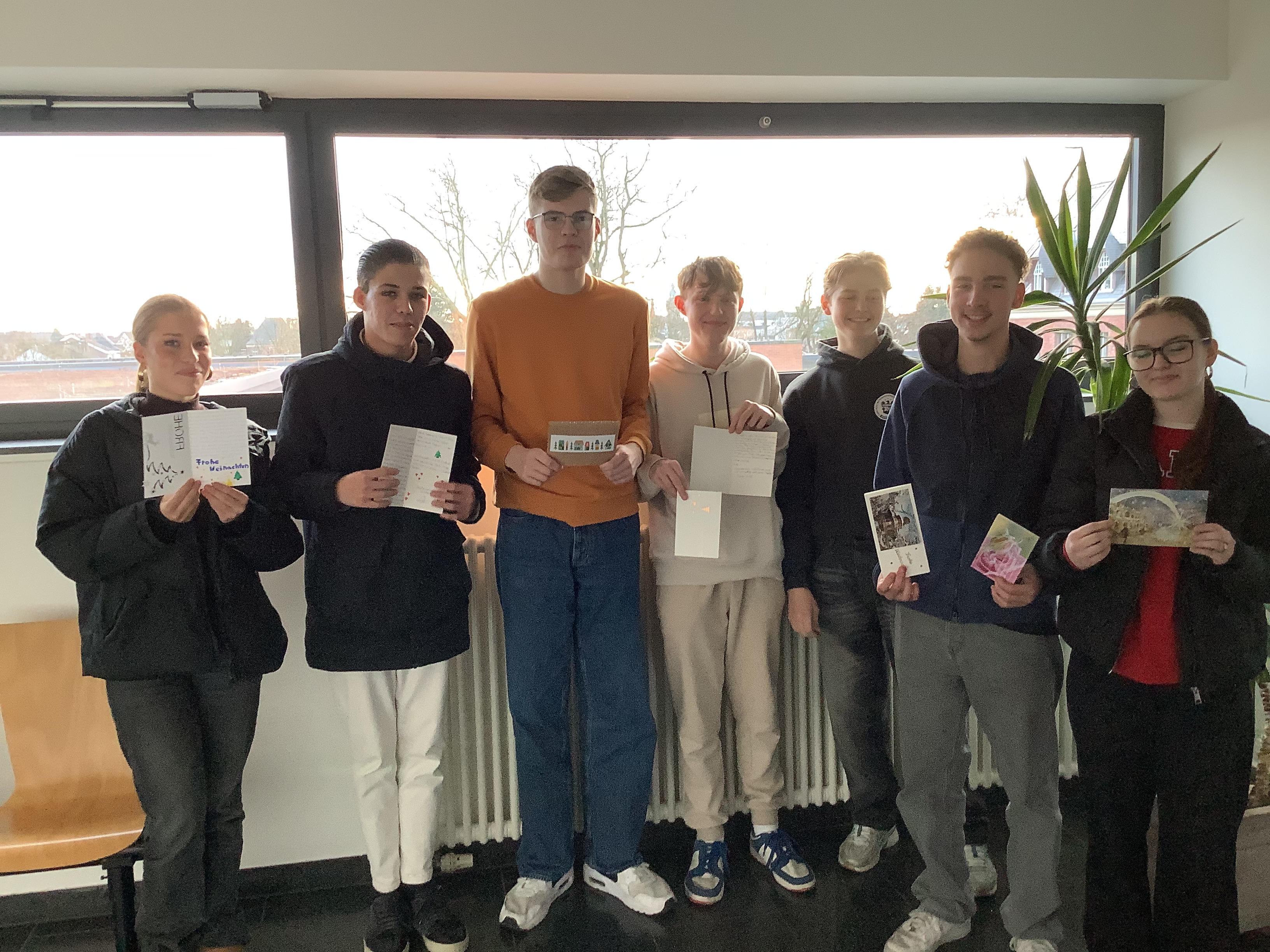 Wir als evangelischer Religionskurs der Unterstufe haben uns entschlossen, an die Bewohner und Bewohnerinnen eines Altenheims in Ahlen Weihnachtskarten zu schreiben. Wir möchten im Advent damit einsamen Menschen eine Freude machen.